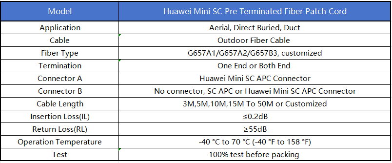 Huawei Compatible Mini SC pre-terminated OSP drop cables provide easy FTTx (Fiber-To-The-X) installation and termination using existing hardware and installation methods for drops to homes and businesses. Its flat profile is compatible with existing wedge (P) clamps. This connector always come with 2.0*3.0mm self-supporting drop cable, 3.0mm indoor cable, or 5.0mm round cable.